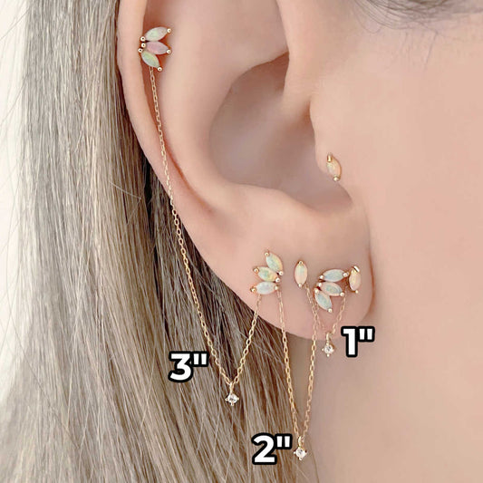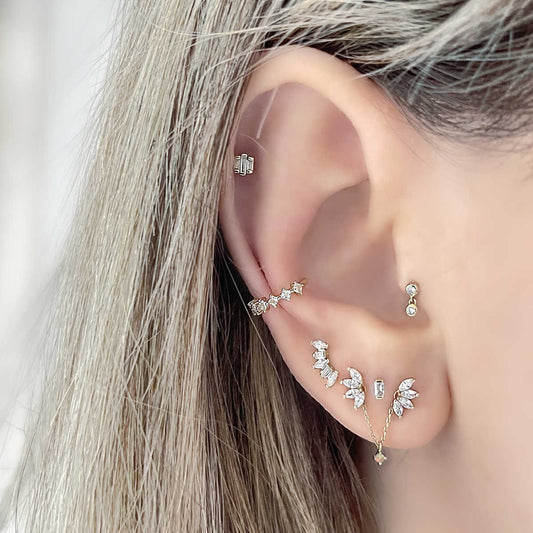 Customize your studs & hoops with our interchangeable earring charms, level up your double piercing with our floating diamond and opal stud dangles, rock our helix to lobe connector chain, and finish the look with our no piercing gemstone ear cuffs!