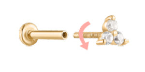 Insert the earring through the front of your piercing and align to the post. Holding both pieces, screw the post onto the earring