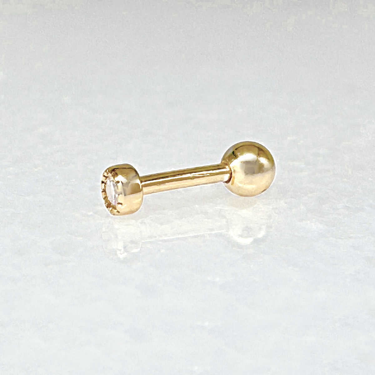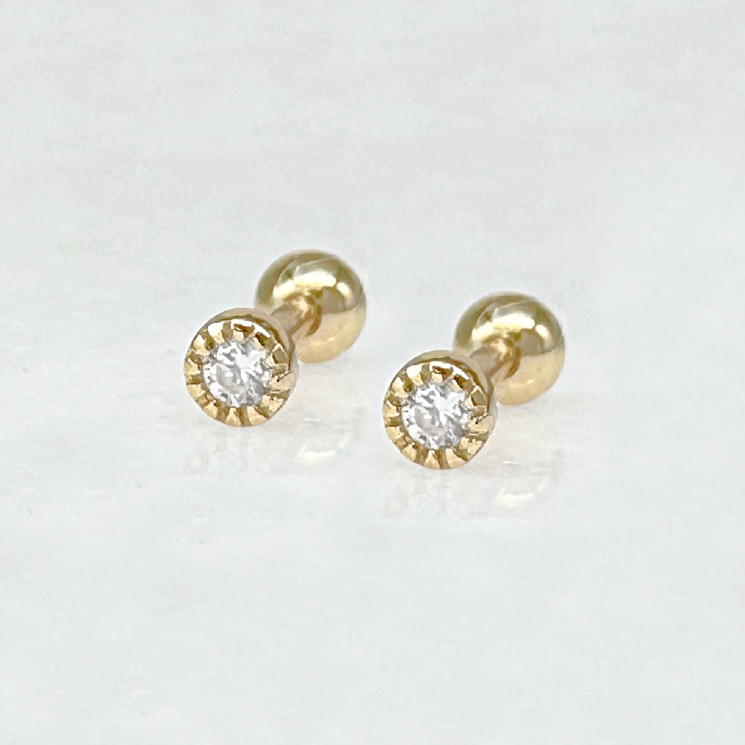 Our classic Bezel Stud Screw Back Cartilage Earring features a gold millgrain bezel and a secure ball style screw back. Perfect for your lobe, helix, or conch, this 14k gold plated sterling silver stud adds a touch of elegance to any look.