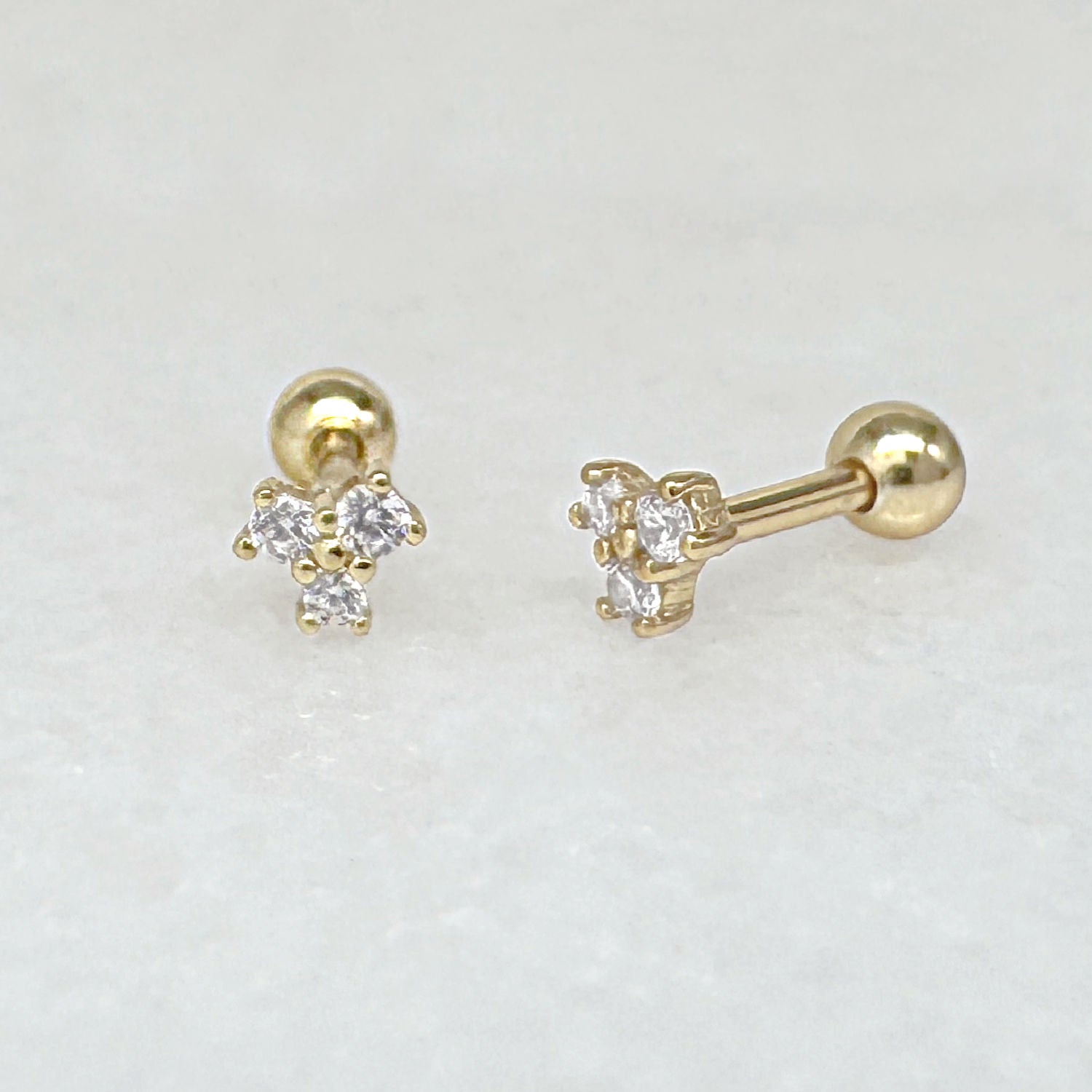Introducing our classic 3-stone cluster earring with a sturdy ball screw back. Versatile for your lobe, helix, or conch, this stud in 14k gold plated sterling silver adds an elegant touch to any look.