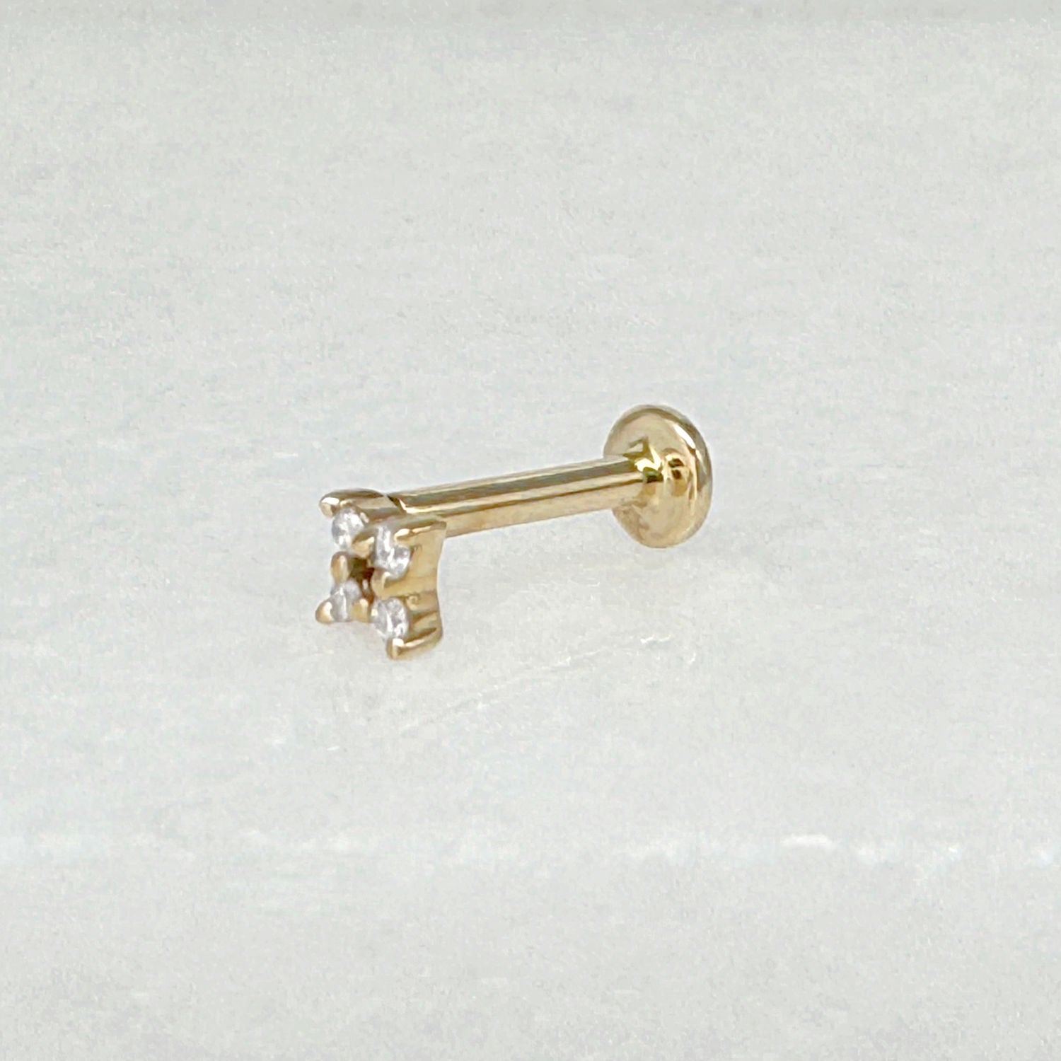 Our sparkling four point star stud, in 14k gold and diamonds, features a threaded screw back closure to keep it secure and allow for wear in either your earlobe or cartilage. The tiny size is especially great for a tragus!