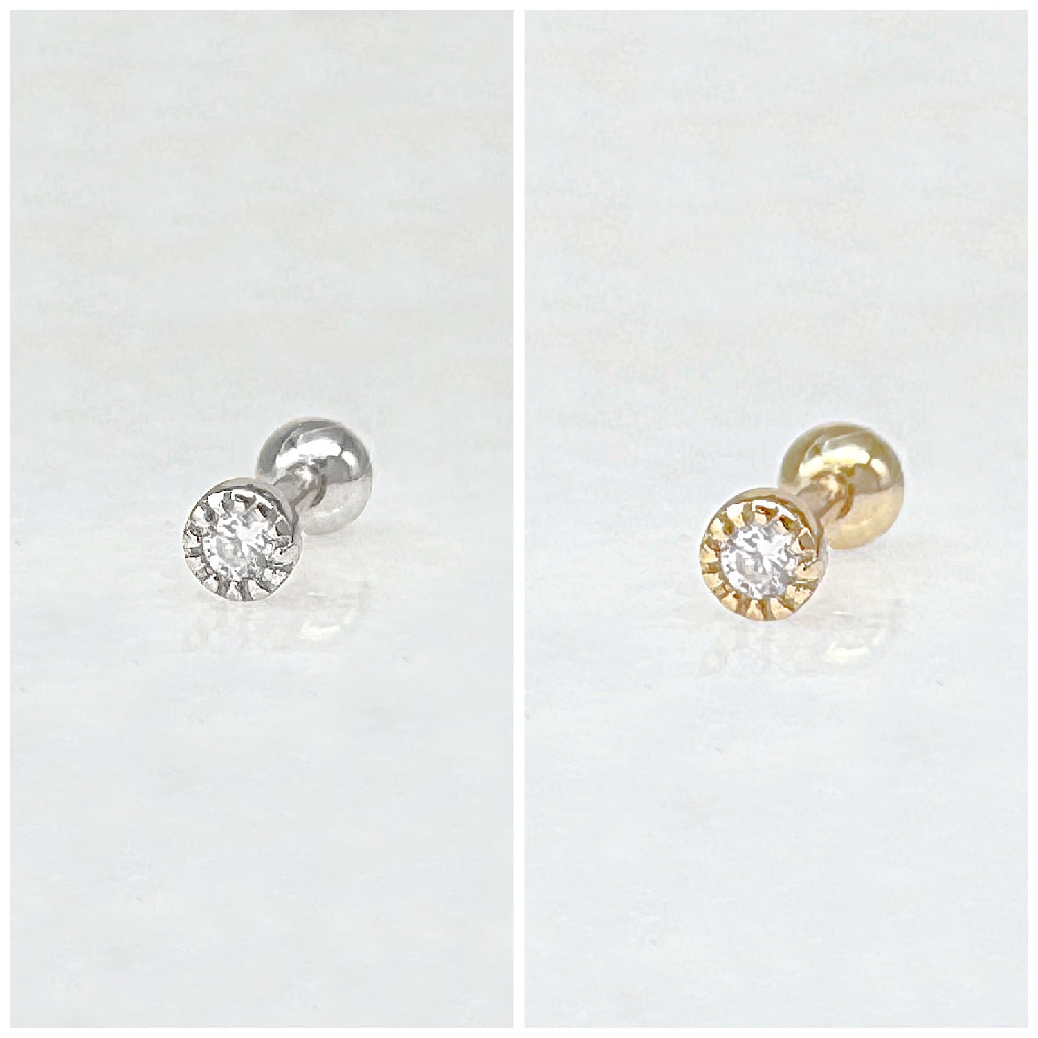 Our classic Bezel Stud Screw Back Cartilage Earring features a millgrain bezel and a secure ball style screw back. Perfect for your lobe, helix, or conch, this set includes one each of our gold and silver versions, to add a touch of elegance to any look!