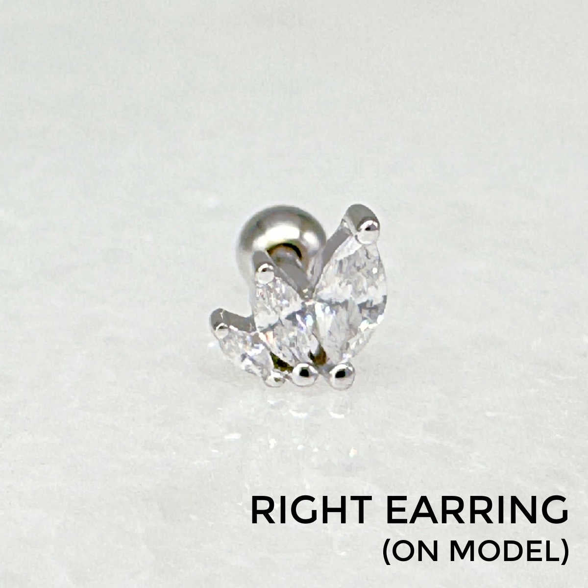 Our Lotus Screw Back Earring features a beautiful flower design and is secured with a ball back, ensuring it stays in place all day (and night) in your helix, conch, or second piercing. Made in sterling silver and adorned with graduated marquise gemstones, this earring is available in both left and right orientations. (So you can have one on each side, yay!)