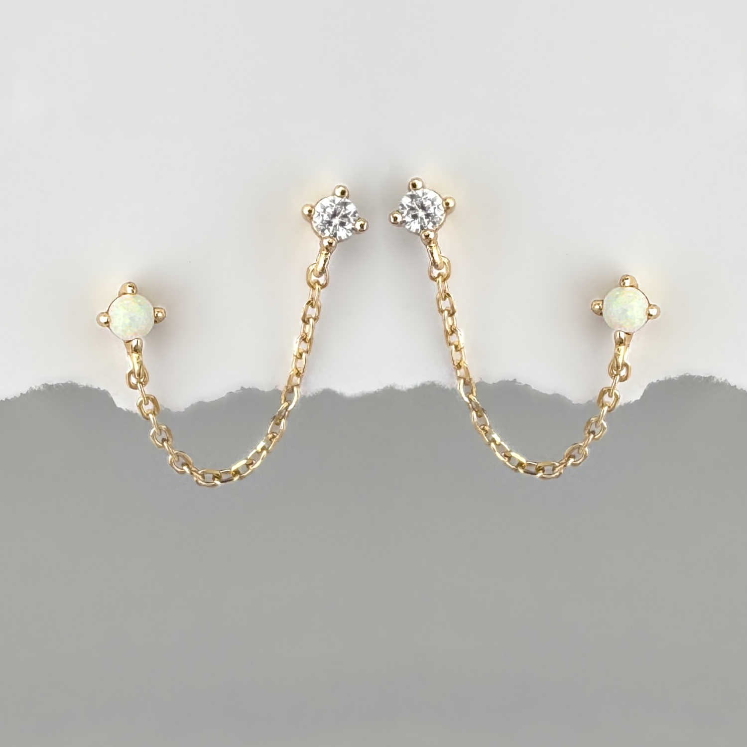 These double stud earrings are perfect for linking your piercings with a touch of fun! Featuring shimmering opals and sparkling gems connected by a delicate swinging cable chain, they add a playful sparkle to any set of multiple lobe piercings.